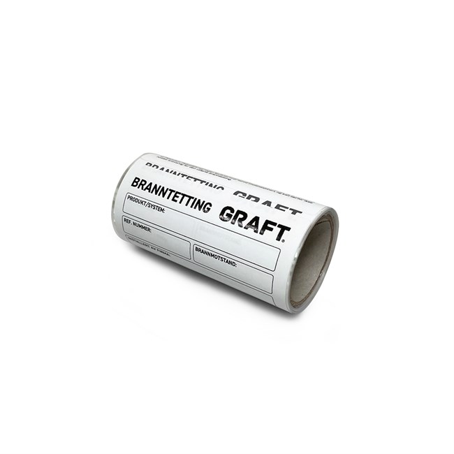 GRAFT Brannetikett brukes til å merke installerte GRAFT branntettinger. Den gir brukeren av bygget en oversikt over hvilken brannmotstand branntettingen innehar, hvem som har utført arbeidet og hvilke produkter som er benyttet.